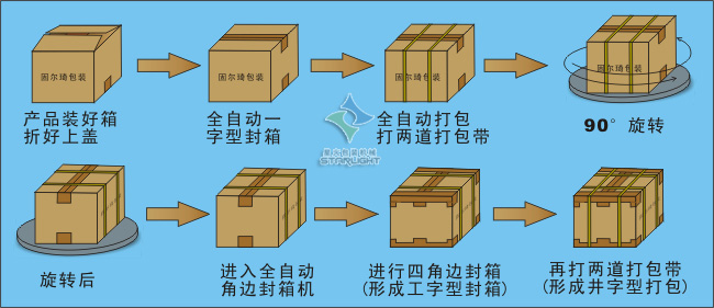帶子送到位→收到捆扎信號→制動器放開,主電機啟動(1)→右頂?shù)渡仙?,頂住右?guī)в诨逄帲?)→“T”型導(dǎo)板后退(3)→接近開關(guān)感應(yīng)到退帶探頭(4)→主電機停轉(zhuǎn),制動器吸合(5)→打包機退帶電機轉(zhuǎn)動,退帶0.35秒(6)→帶子收緊捆在物體上(7)→主電機二次啟動,制動器吸合(8)→大擺桿二次拉帶,收緊帶子(9)→左頂體上升,壓緊下層帶子(10)→加熱片伸進兩帶子中間(11)→中頂?shù)渡仙?,切斷帶子?2)→中頂?shù)断陆担?3)→中頂?shù)对俅紊仙?,使兩帶子牢固粘合?4)→中頂?shù)断陆?,左右頂?shù)锻瑫r下降(15)→加熱片復(fù)位(16)→滑板后退(17)→“T”型導(dǎo)板復(fù)位(18)→接近開關(guān)感應(yīng)到送帶探頭(19)→送帶電機啟動,帶動帶子送帶(20)→大擺桿復(fù)位(21)→帶子到位,帶頭頂?shù)健癟”型導(dǎo)板上(22)→接近開關(guān)感應(yīng)到雙探頭(23)→主電機停轉(zhuǎn),剎車吸合(24)→打包機完成一個工作循環(huán)。星火平頂山打包機有限公司的打包機設(shè)計合理是食品行業(yè)眾所周知的,它的工作流程簡單快捷符合企業(yè)的生產(chǎn)使用要求,因此平頂山打包機的成功絕對不是偶然的而是經(jīng)過科研人員的不懈努力換來的。